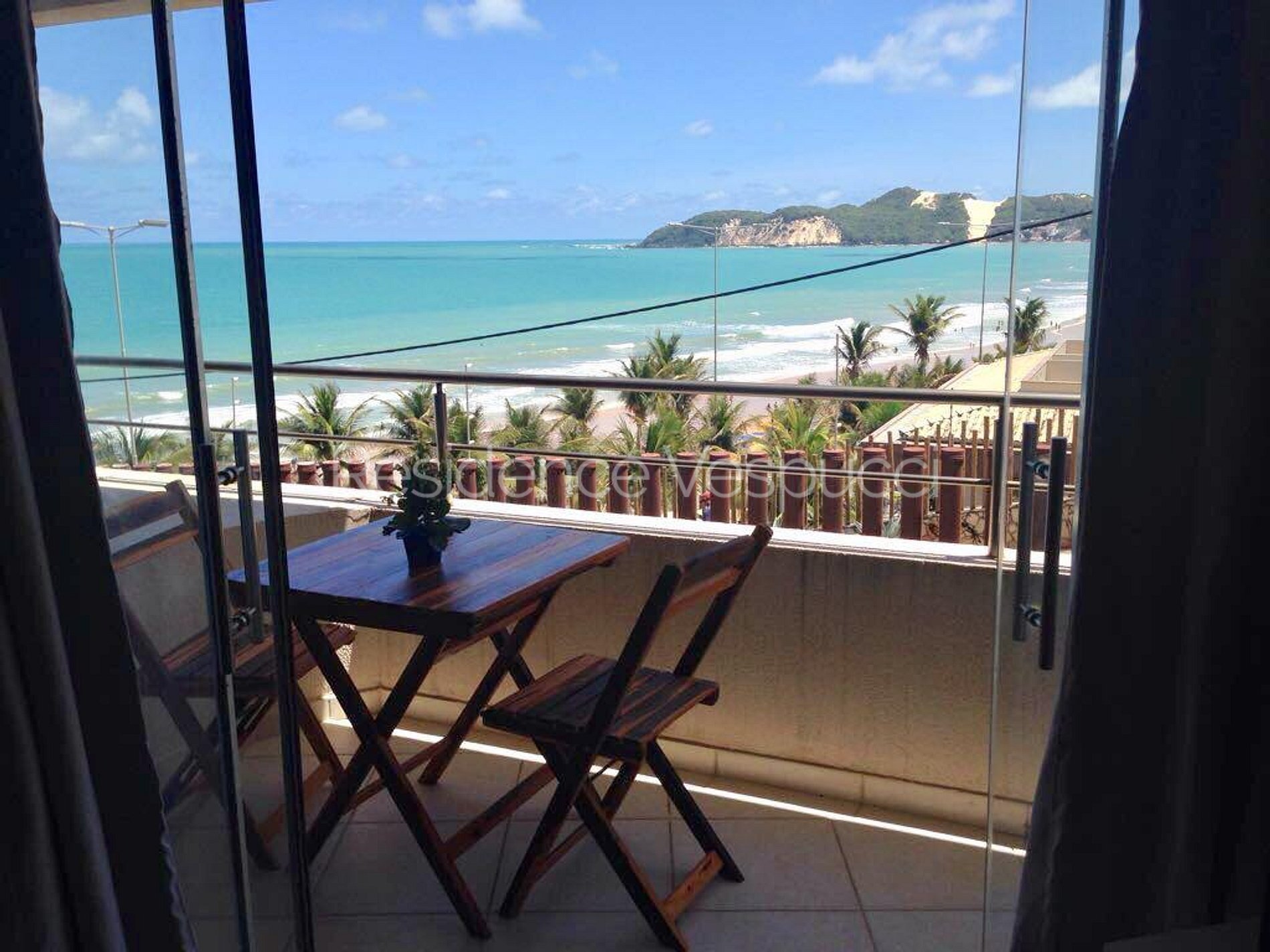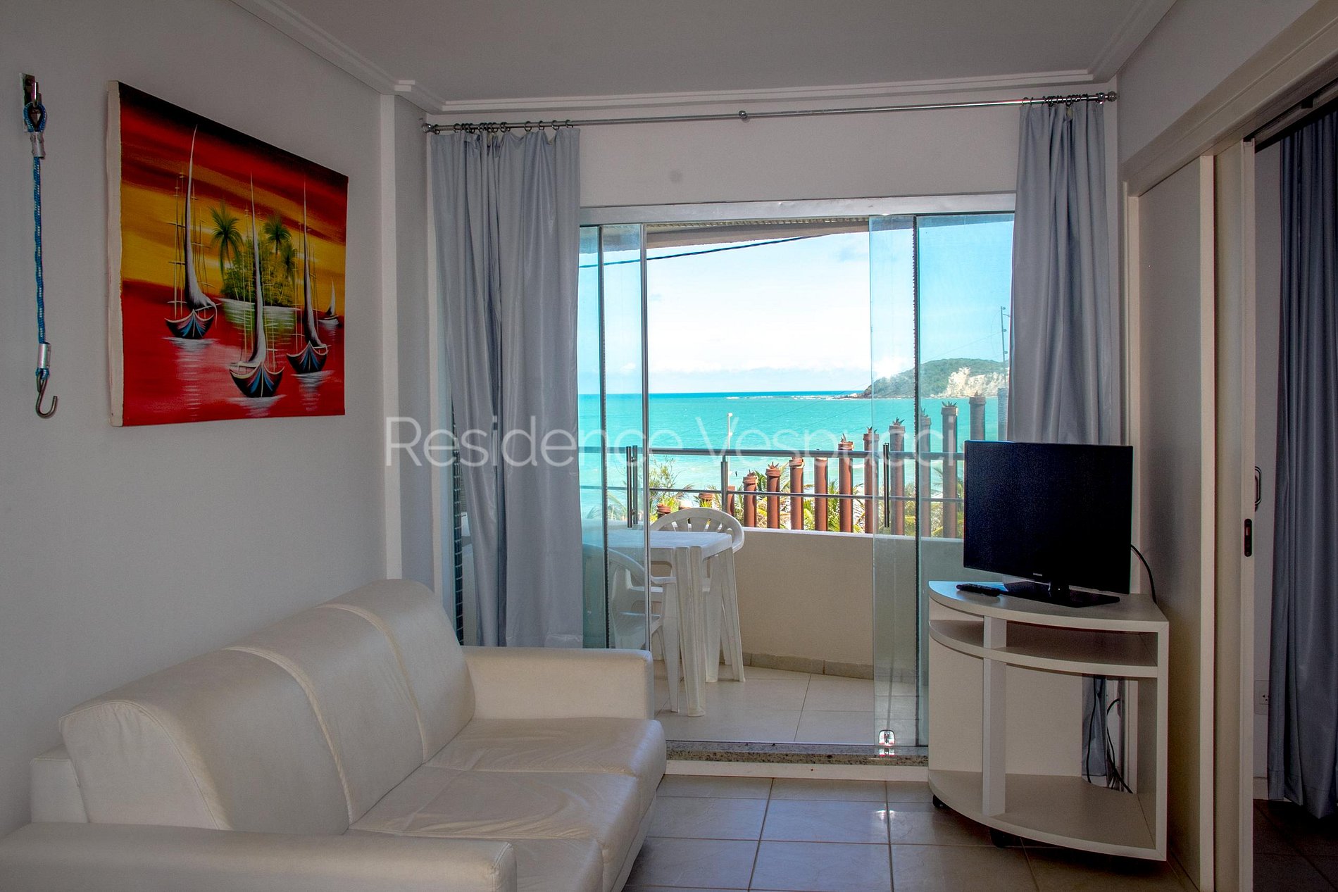 O Flat é composto por um quarto com cama de casal e ar condicionado, um quarto com duas camas de solteiro e ar condicionado, uma varanda com vista do mar, uma sala de estar com sofá e Tv a cabo, uma cozinha equipada com microondas, geladeira, cooktop e utensílios. Também está disponível para uso, ferro de passar roupas e secador de cabelo.Tem Wifi grátis e estacionamento em área externa e anexa ao prédio. Estão incluídos café da manhã variado, limpeza diária, roupas de cama e toalhas. A poucos passos dos melhores restaurantes da cidade, incluindo o famoso restaurante Camarões. Hospeda até 5 pessoas.